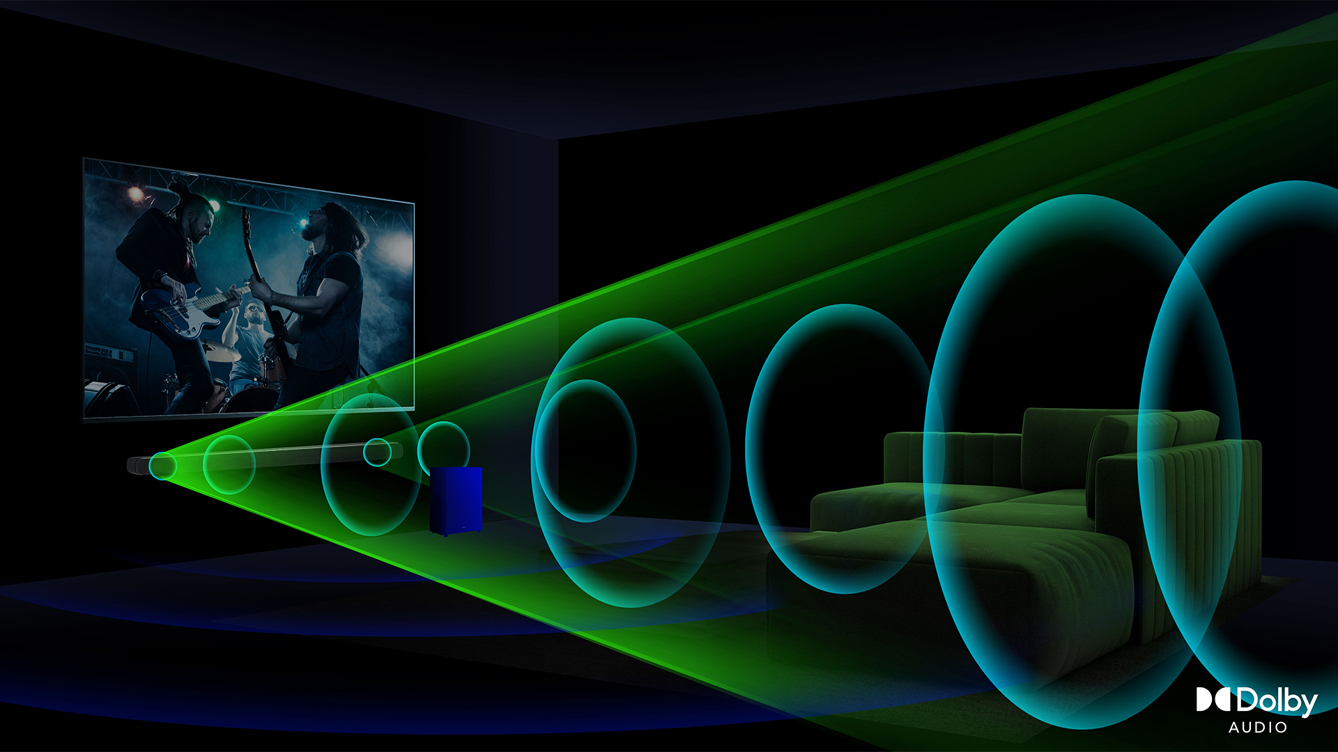 Barra de sonido de 2.1 canales con Dolby Audio y Subwoofer inalámbrico